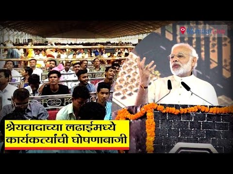 दुसरीकडे नरेंद्र मोदी यांचे वांद्रे-कुर्ला संकुलामध्ये आगमन होताच भाजपा कार्यकर्त्यांनी घोषणाबाजी सुरू केली. चंद्रकांत पाटील यांच्या भाषणाच्यावेळी शिवसैनिकांचा जोर चढला आणि त्यांचाही आवाज वाढला. या वेळी शिवसैनिकांनी आवाज कुणाचा शिवसेनेचा अशा घोषणा द्यायला सुरुवात केल्या. तर भाजपाकडून हर हर मोदी, घर घर मोदी च्या घोषणा सुरू होत्या. दोन्हीकडून आवाज वाढल्याने नरेंद्र मोदी स्टेजवर असतानाच दोन्ही पक्षांचे कार्यकर्ते भिडले. अखेर मग मुख्यमंत्र्यांनाच शांततेचं आवाहन करावं लागलं.