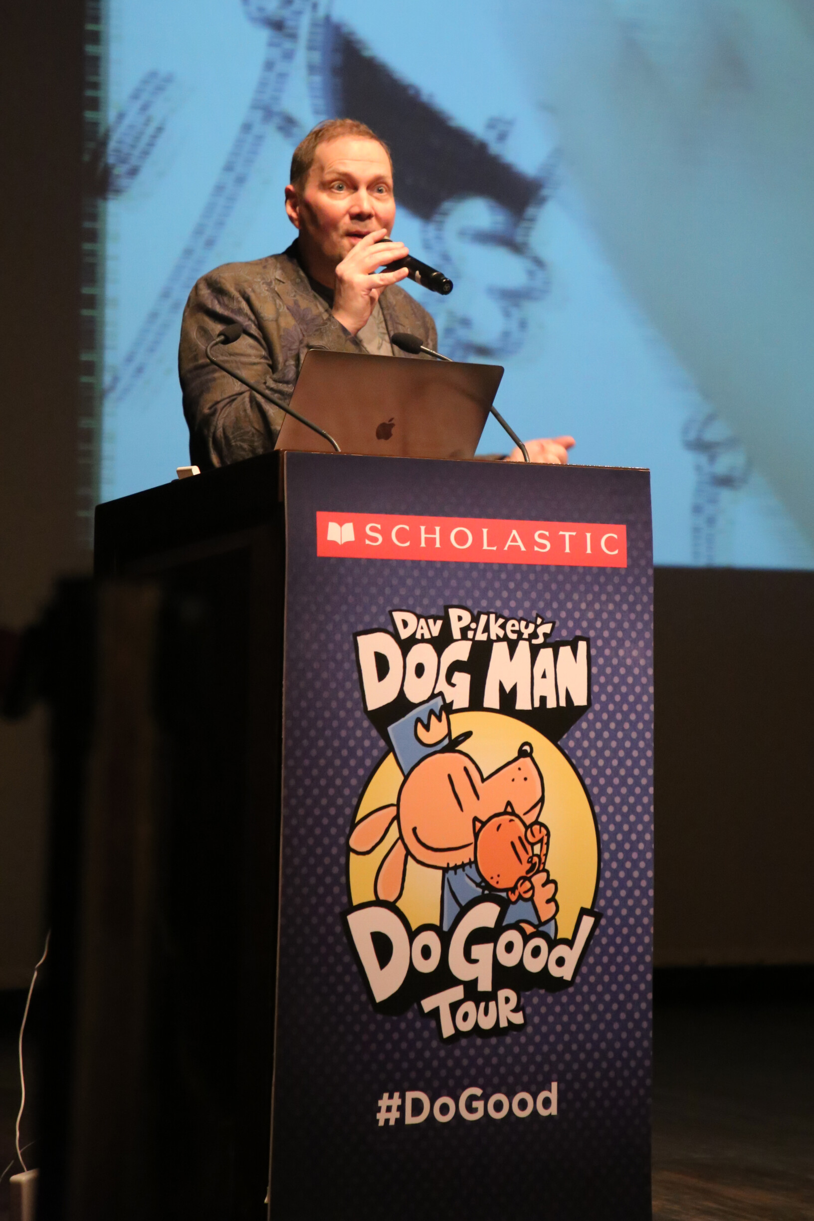 The event involved fun activities, live drawing sessions, an interactive presentation by Dav Pilkey, and photo opportunities with a Dog Man costumed character.
