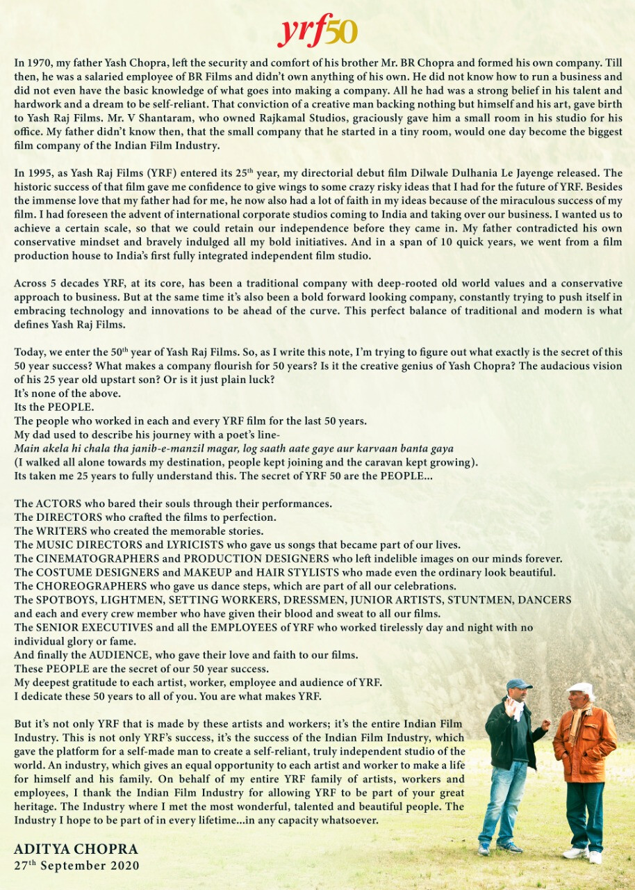 Aditya Chopra revealed the special logo today, the 88th birth anniversary of his iconic father, late Yash Chopra. In a heartwarming note that was released earlier by Aditya to kick start the 50-year celebrations, he had said, “In 1970, my father Yash Chopra, left the security and comfort of his brother BR Chopra and formed his own company. Till then, he was a salaried employee of BR Films and didn’t own anything of his own. He did not know how to run a business and did not even have the basic knowledge of what goes into making a company. All he had was a strong belief in his talent and hard work and a dream to be self-reliant. That conviction of a creative man backing nothing but himself and his art gave birth to Yash Raj Films.”