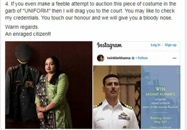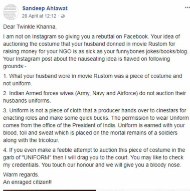 Recently actor-columnist Twinkle Khanna took to Instagram and shared that the Indian Navy uniform (costume) that Akshay Kumar wore in Rustom will be auctioned. The post read, "Using all the goodwill I have left to raise money for a good cause :) Do bid folks! And thank you @karanjohar @hrithikroshan @sonamkapoor and of course @akshaykumar for giving all this fab stuff to @saltscout toward the Janice Smith trust for animal welfare! www.SaltScout.com".