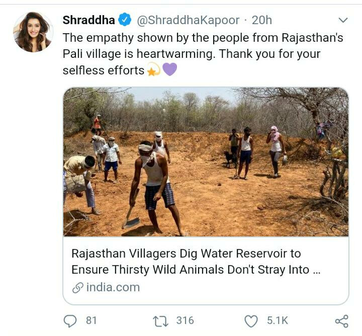 Bollywood actress Shraddha Kapoor has always promoted and spoken for the safety and protection of animals, and in a recent post, she expressed her feelings for the efforts put by some villagers in Rajasthan, who stepped forward to help animals.