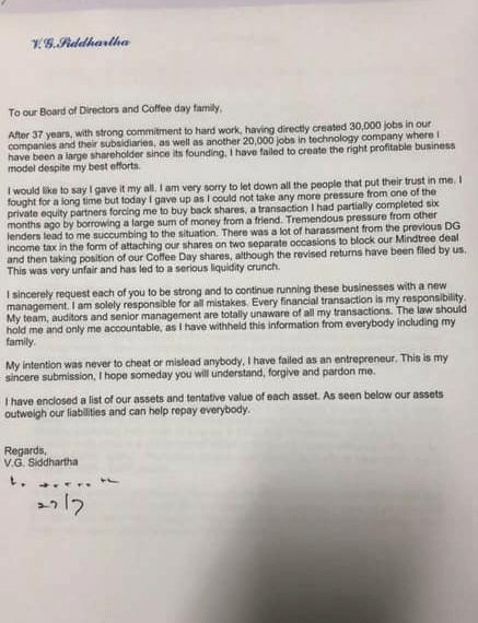 The driver found a letter which described his anguish of failing to make his company profitable. He concluded the letter by saying that his intentions were never to hurt or mislead someone and that he has failed as an entrepreneur. The letter was addressed to the Board of Directors and the Coffee Day family. Following is the content of the letter: