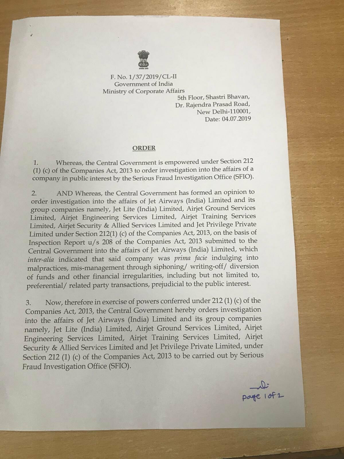 The Central Government has ordered an investigation into Jet Airways and its group of companies including Jet Lite, AirJet Technologies etc. and said that the company was prima facie indulging into malpractices like mismanagement through siphoning, writing-off, diversion of funds and other financial irregularities, including but not limited to, preferential/ related party transaction, prejudicial to the public interest.