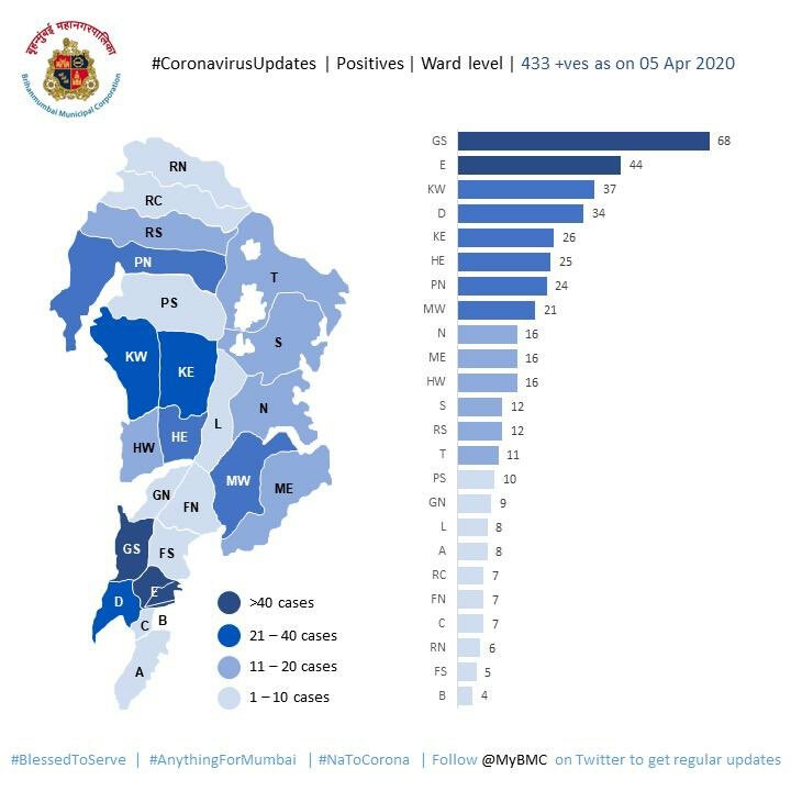 As of Sunday, April 5, 2020, 433 positive cases were identified in the city, out of which many were from Andheri West and East. While most cases were reported from Worli and Prabhadevi areas, other localities like Grant Road and Andheri were also on the top of the list with many cases. Here's a ward-wise list released by the BMC.