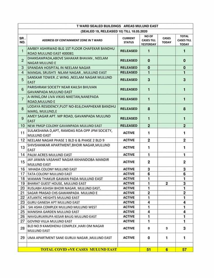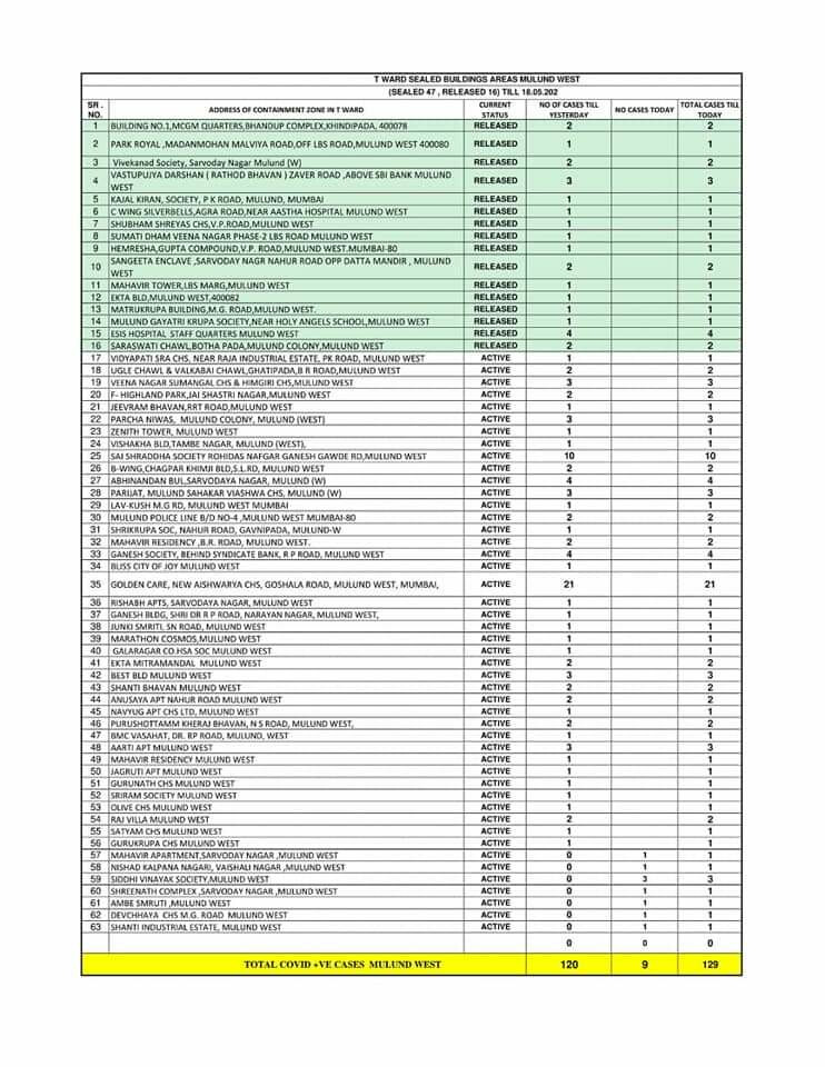 The Brihanmumbai Municipal Corporation (BMC) on May 18, 2020, released the list of containment zones in Mulund (Ward-T) along with the buildings which were sealed in Mulund East and West. As per the report, 15 areas have been sealed as containment zones or red zones in Mulund, and none have been released yet by the officials. These include: