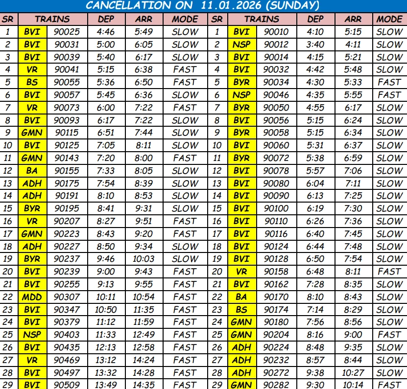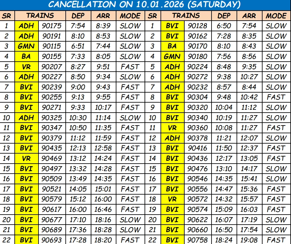1. Train No. 19426 Nandurbar – Borivali Express, journey commencing on 10th January, 2026 will short terminate at Vasai Road.