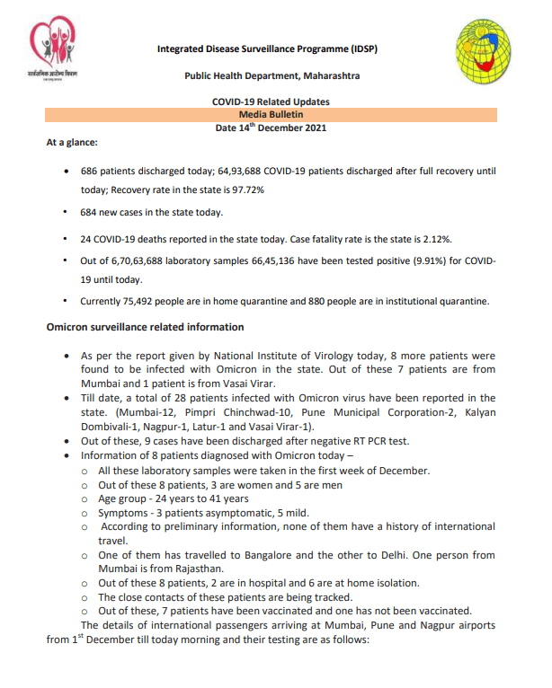 Besides, Maharashtra on Tuesday, December 14, recorded 684 fresh cases and 24 deaths in 24 hours.
