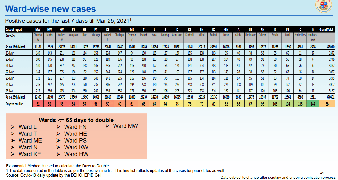 Mumbai's average COVID-19 doubling rate stands at 68 days, with Chembur West, Bandra, Andheri West, Goregaon and Khar being the most affected. A total of 11 wards in Mumbai have a lower doubling rate in comparison to the average.
