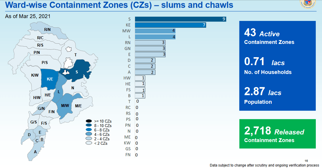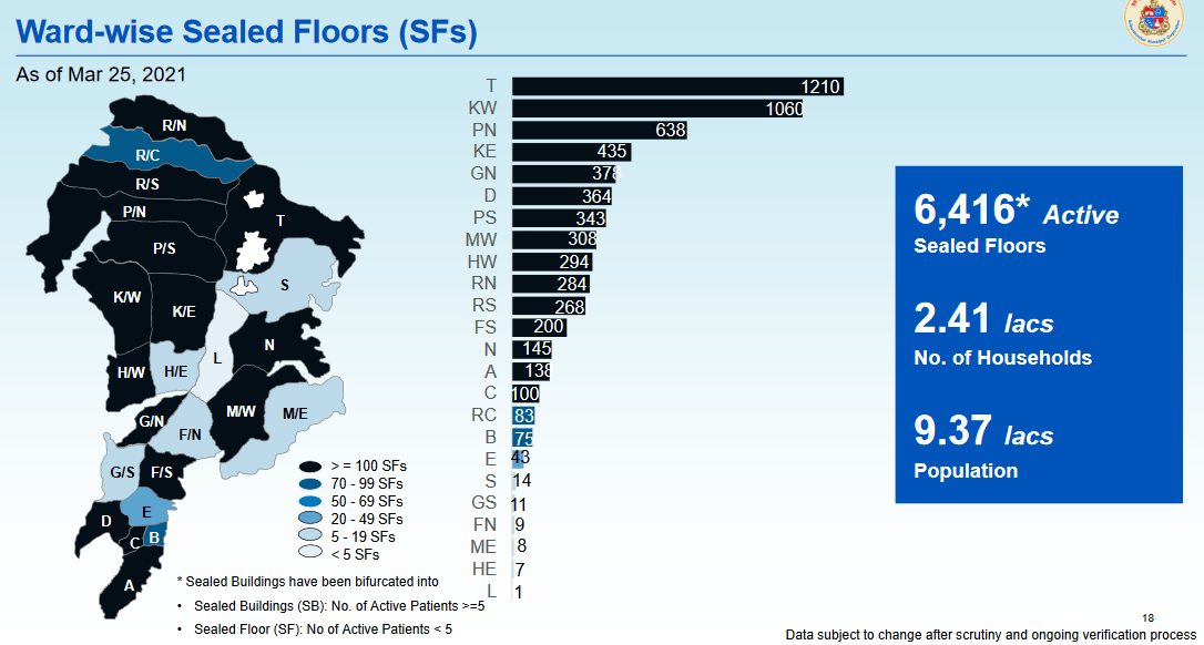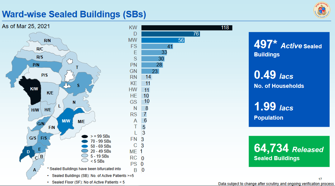 Ward S (Bhandup), K-East (Andheri East), M-West (Chembur) and L (Kurla) had the most number of areas sealed. Ward K-West (Andheri West), D, M-West (Chembur) and F-South, have the most number of buildings sealed in Mumbai. Moreover, Ward-T (Mulund), K-West (Andheri West), P-North, and K-East (Andheri East) have the most floors sealed.