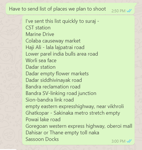 After passing through two different police check-points, I reached Chembur in 35 mins to join my co-director, Omkar Phatak, in his car. We’ve been friends for 10 years, and this was the first time I met him where we didn’t do the casual bros hug. Just a simple, “hey, all good?” And we left in his car. He too was wearing a mask.