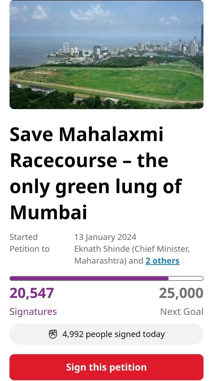 One petitioner has even proposed to turn the Mahalaxmi racecourse into an urban forest. Another petitioner was quoted as pleading, "Race course has been my lung, livelihood, health, recreation, and walking ground. It has been a contributor to my longevity as a diabetic and a respiratory disease patient. Please don't take my life."