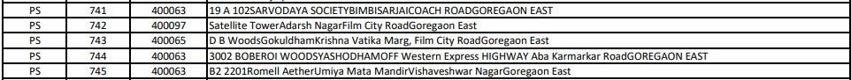 Here is a list of building/s that are sealed in Ward PS which includes Goregaon East