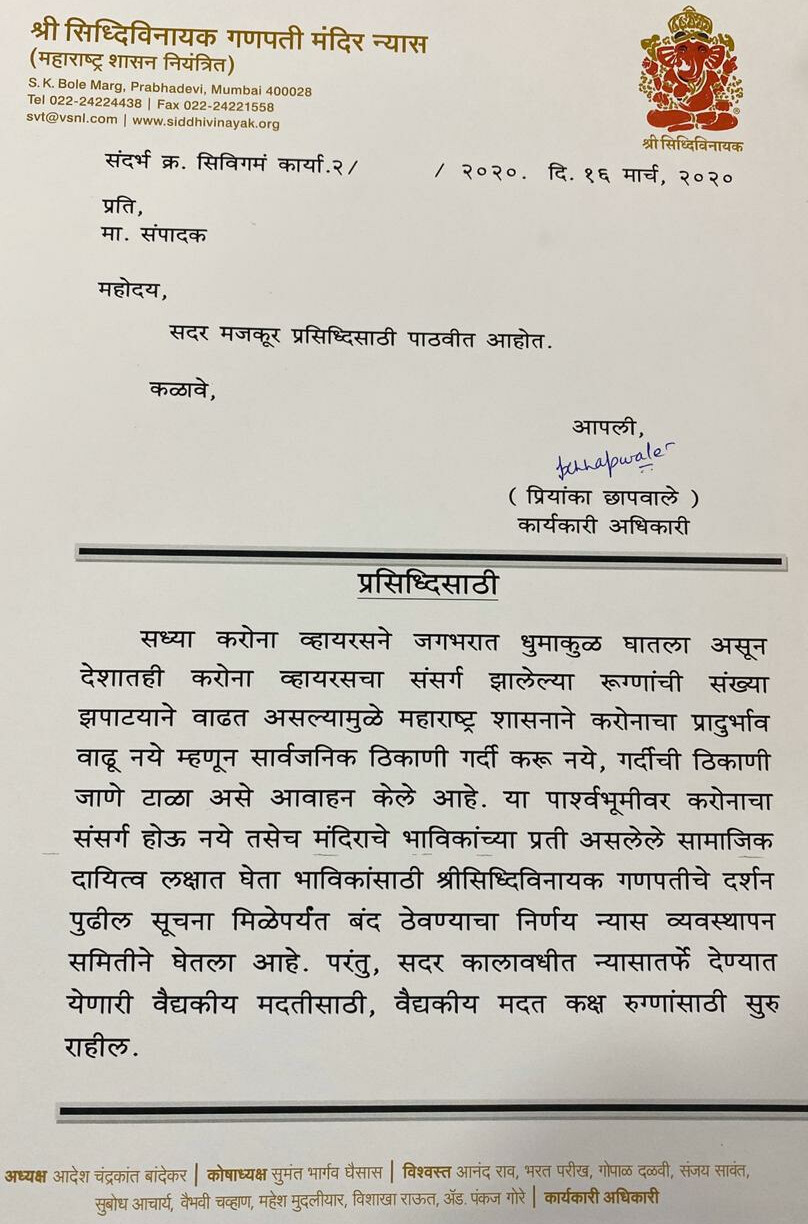 With a sudden spike in the number of people infected with the novel coronavirus in the state, the government is taking all the necessary steps to avoid further spreading of the virus. Amid the COVID-19 outbreak, the lives of commoners have been adversely affected and in one such instance, the Siddhivinayak temple has now been closed for devotees until further notice.