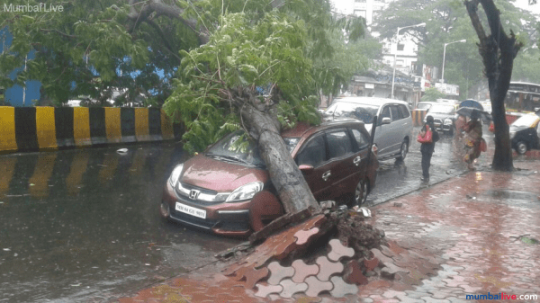 Strong winds and a torrential pour uprooted several trees around the city, causing damage to cars.