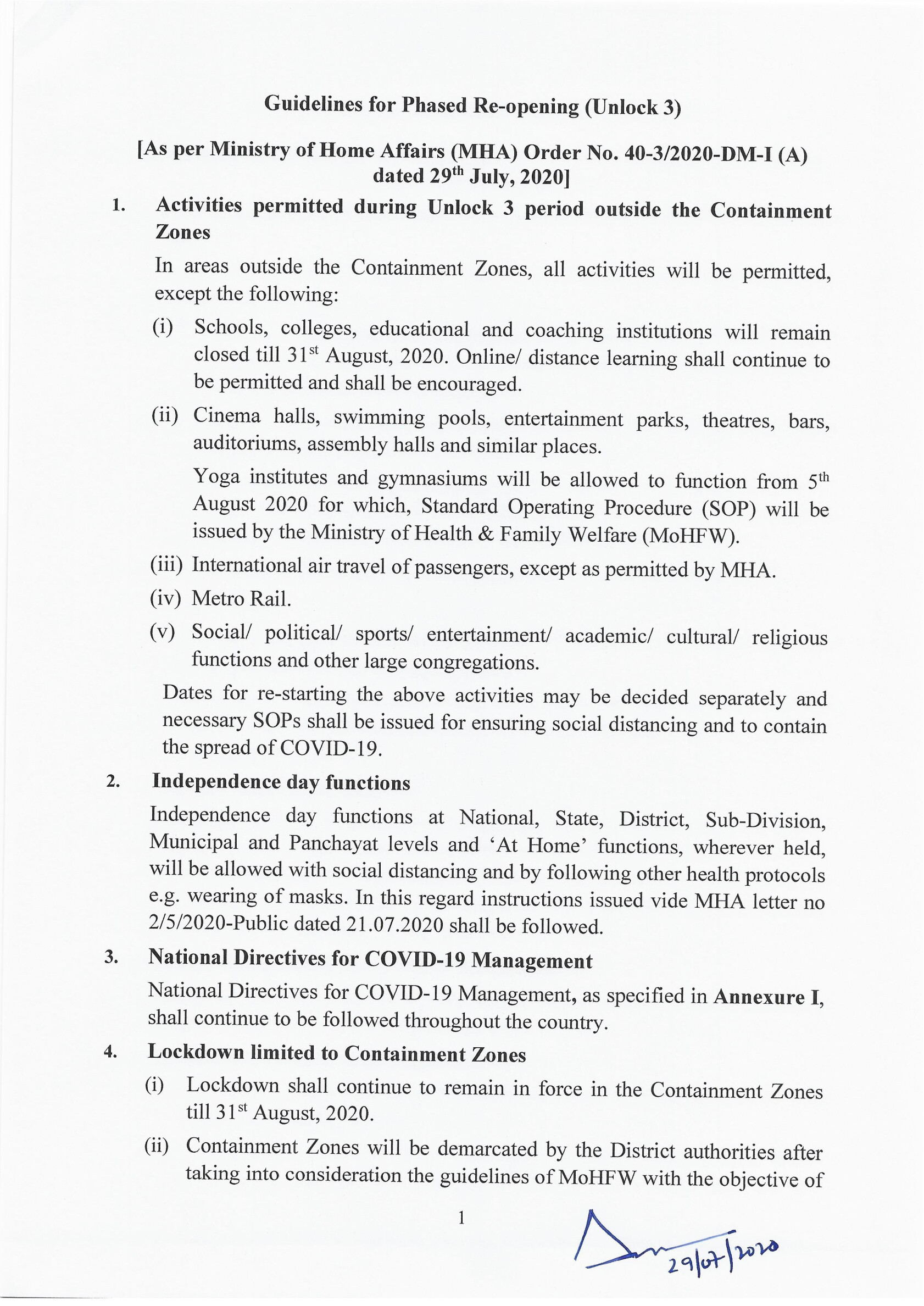 The Unlock 2.0 or lockdown 6.0 is scheduled to end on July 31 midnight. The lockdown in containment zones will continue till August 31 midnight. Restrictions on the movement of individuals during the night have been lifted.