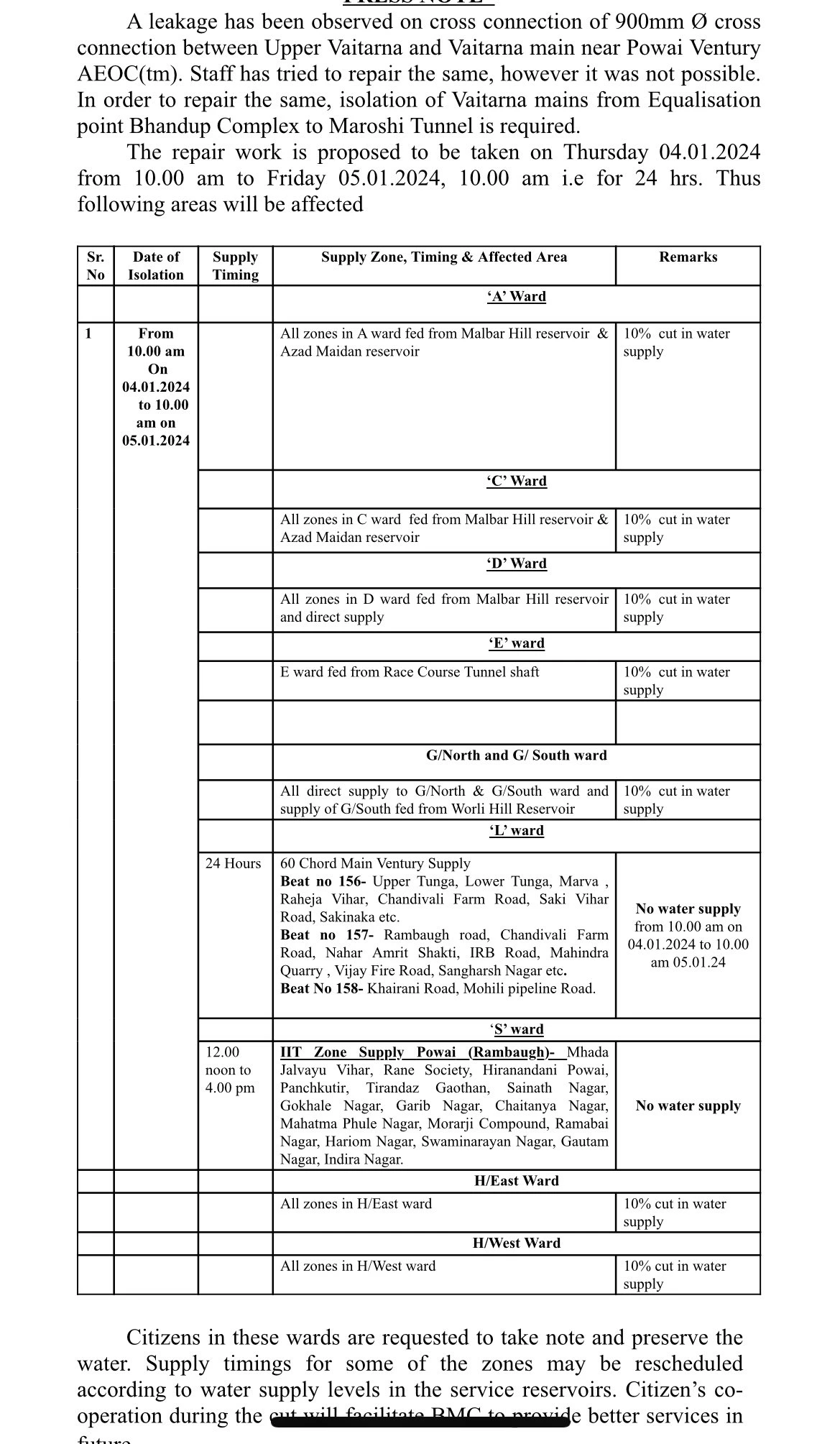 Meanwhile, parts of L ward (Kurla, Chandivali) in the eastern suburbs will see water cut in areas like Upper Tunga, Lower Tunga, Marva, Raheja Vihar, Chandivali Farm Road, Saki Vihar Road, and Sakinaka.