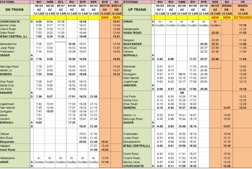 According to an official statement released by WR PRO, 12 AC Local services are being introduced, of which 11 services will replace existing non AC services, while one will be a new AC service. In addition to this, three additional non AC services are also being introduced. With this increase, the total number of AC services will increase from 121 to 133 and the total number of local services of Western Railway network will increase from 1410 to 1414. The number of AC services operating on Saturdays and Sundays will also be significantly increased from 77 to 106, further enhancing comfort and capacity for weekend commuters. In addition to this, a slow local service that is presently operating from Bhayandar to Bandra will operate from Virar, providing added convenience and improved connectivity for commuters.