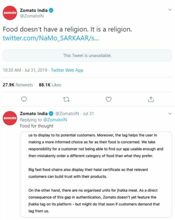 On July 31, food aggregator giant Zomato was compelled to tweet by a certain Twitter user Amit Shukla, who had announced that he did not want a ‘non-Hindu’ deliveryman since it was the month of Shravan and it went against his faith.