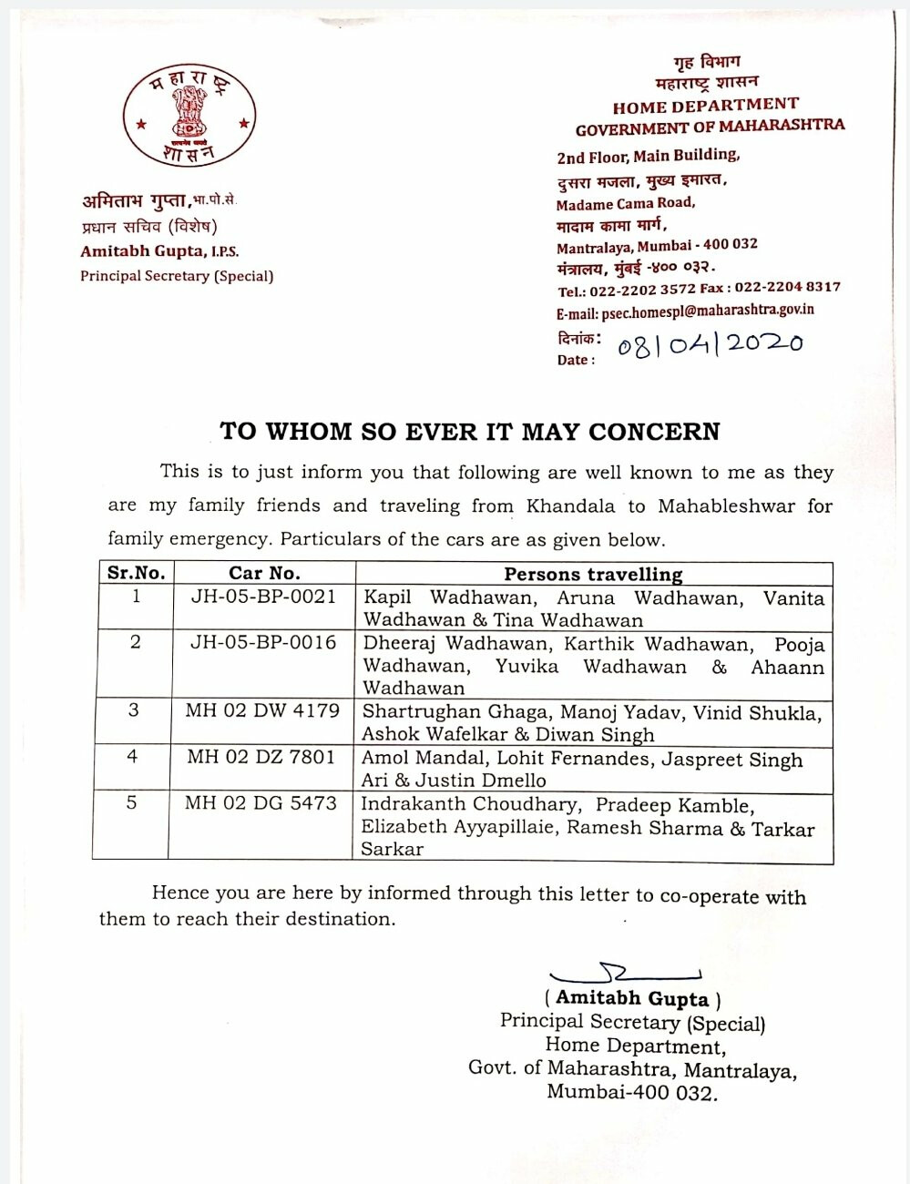 In a video statement, Anil Deshmukh stated that Additional Chief Secretary (Finance) Manoj Saunik will conduct the investigation involving IPS Amitabh Gupta. The Wadhawans have been booked under sections 188, 269, 270, 34 of the Indian Penal Code (IPC) and section 51(b) of the Disaster Management Act and section 11 of the COVID-19 regulations.