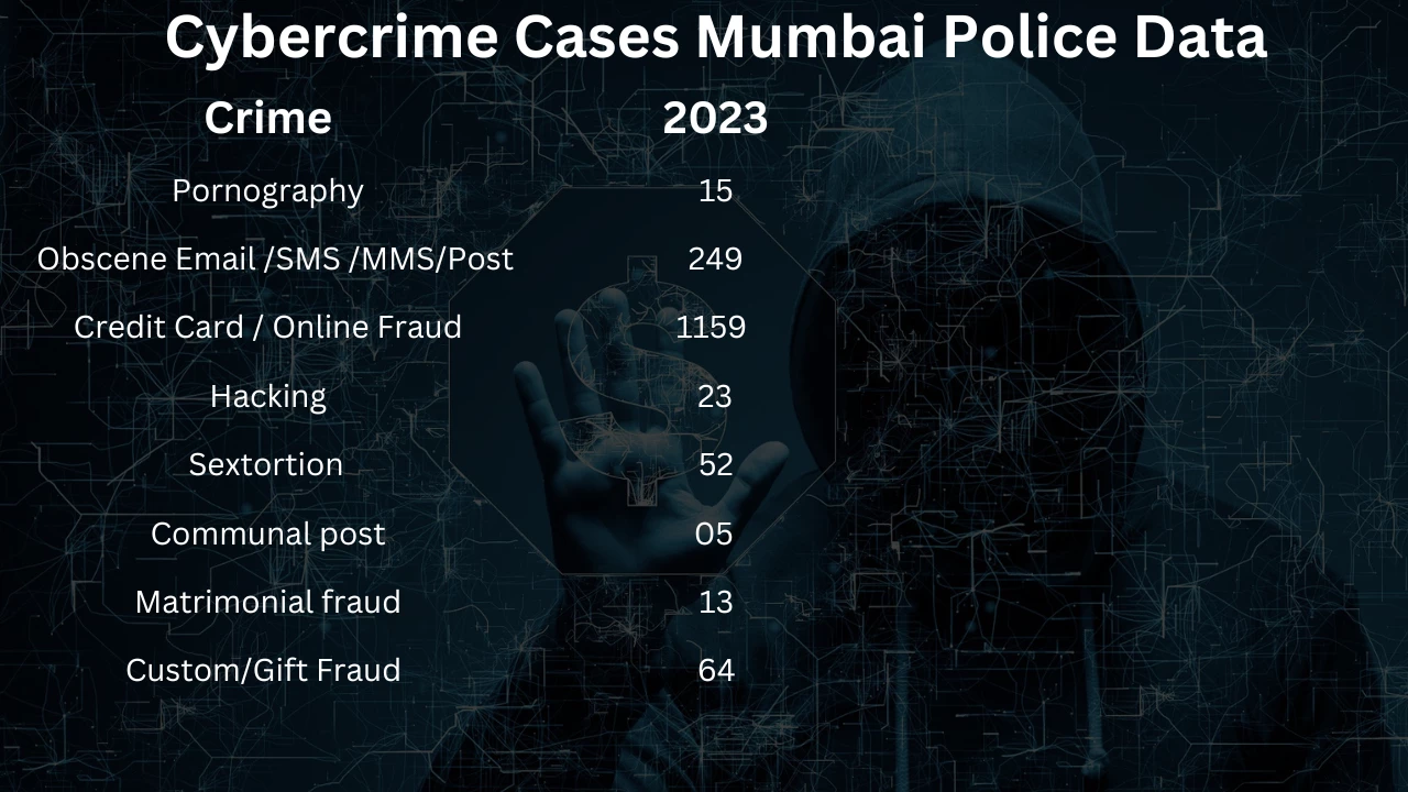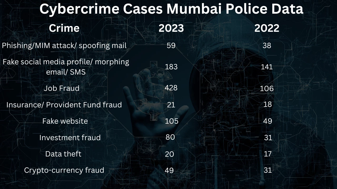 Mumbai Police data revealed that 2023 saw a significant rise in cybercrimes such as phishing/MIM attacks/spoofing mail, insurance/provident fund fraud, job fraud, fake social media profiles/morphing emails/SMS, fake websites, crypto-currency fraud, and investment fraud in the city.