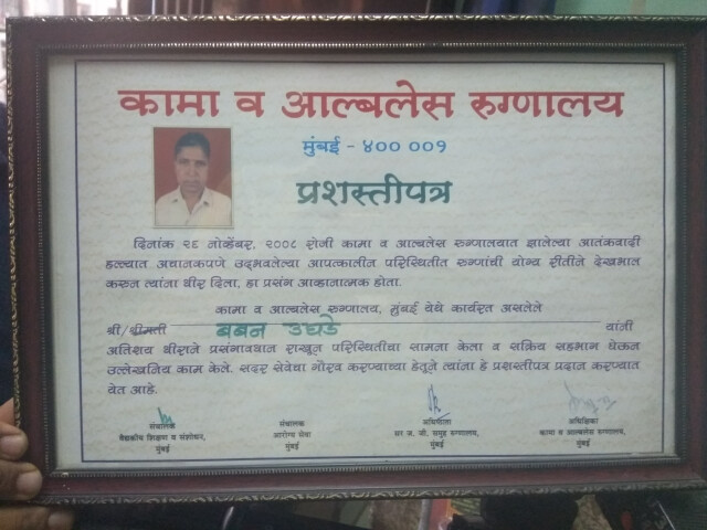 Ughade family who lives in Sion cannot shake off the terrifying memories of 26/11 who took away their loved one. Baban Ughade was working as a security guard with the Cama Hospital. On the day of the attack, when terrorists started firing at Cama hospital, Baban lost his life. He was survived by his wife Sushila and three children. After Baban’s death, his elder son Vilas got the job at Cama Hospital.