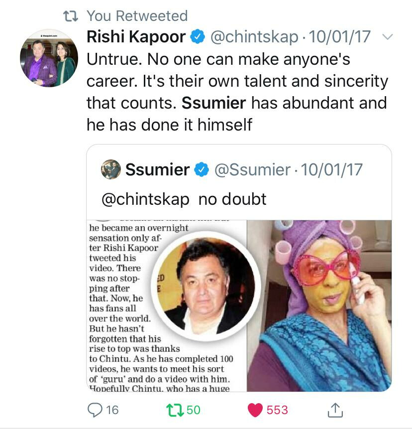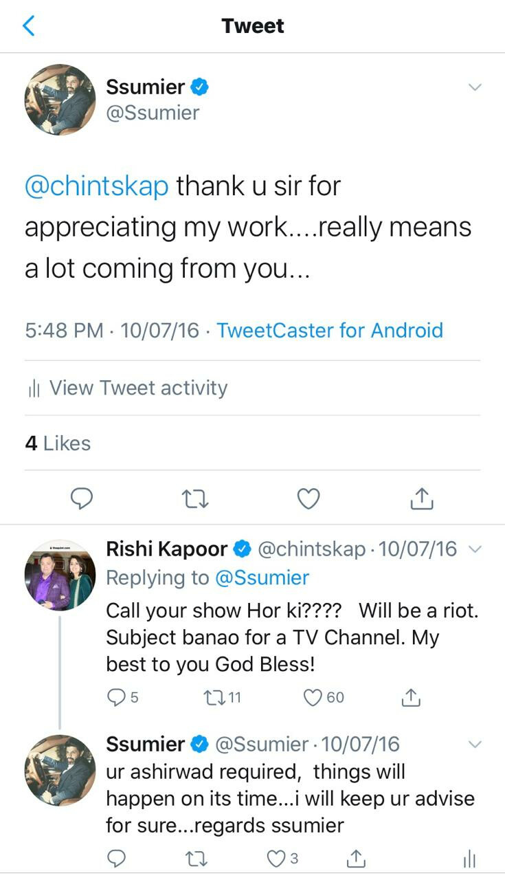 “Ssumier, go to Twitter Right now. Mr Rishi Kapoor is asking about you and looking for you” He told me with a serious tone and that gave me goosebumps. My hands were trembling not knowing what to do with this news and why was he was looking for me, wondering what have I done? Worried, I opened my Twitter account… didn’t know where to check what to check…. I didn’t even know what was his account handle was. My panic mode was on as I was constantly typing and retyping his name to find his verified account then.
