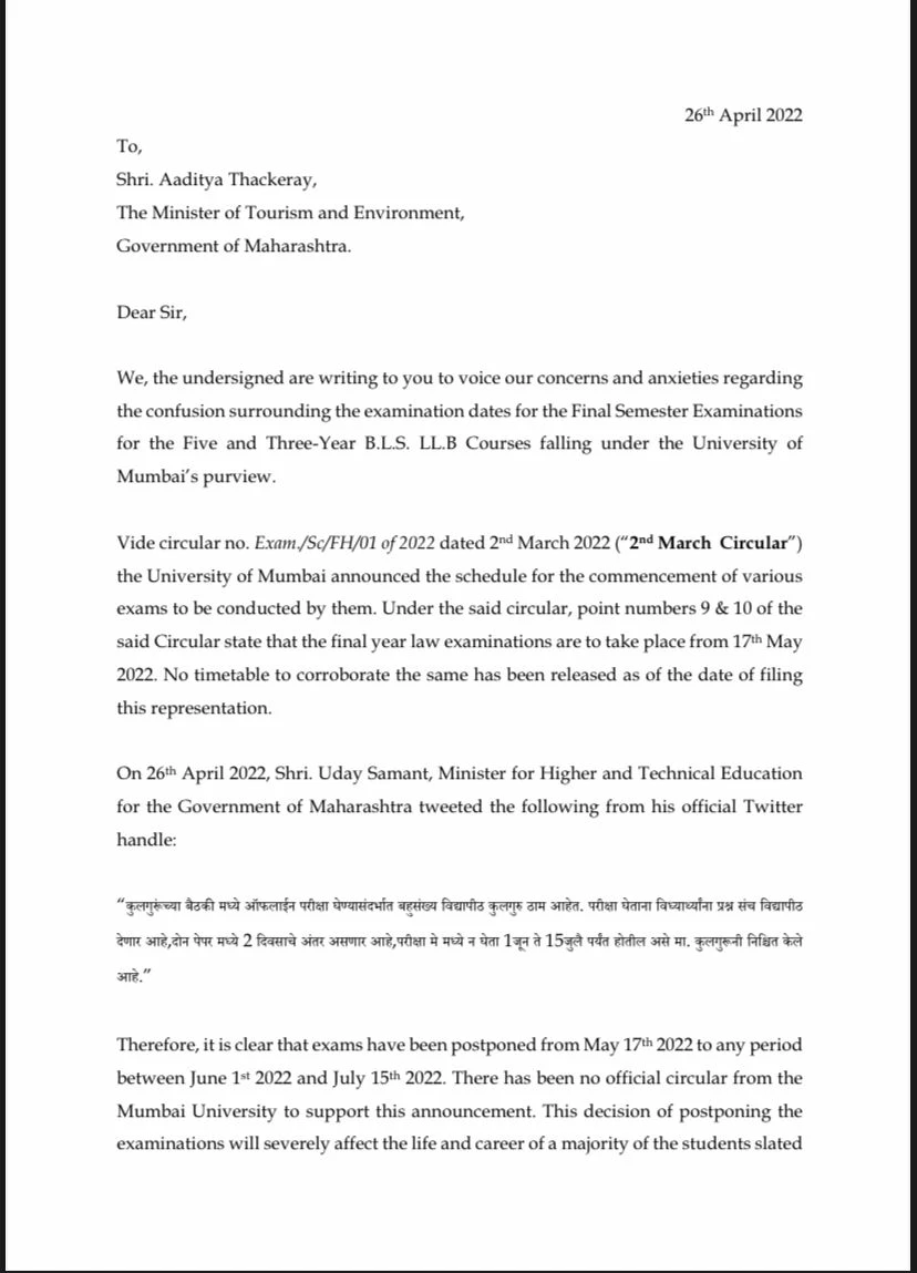 Amid the confusion relating to the examination dates for the final semester examination dates of Mumbai University’s five-and three-year BLS LLB courses, students of some city law colleges have written a letter voicing their concerns to Mumbai suburban guardian minister, Aaditya Thackeray and Maharashtra minister for higher and technical education, Uday Samant.