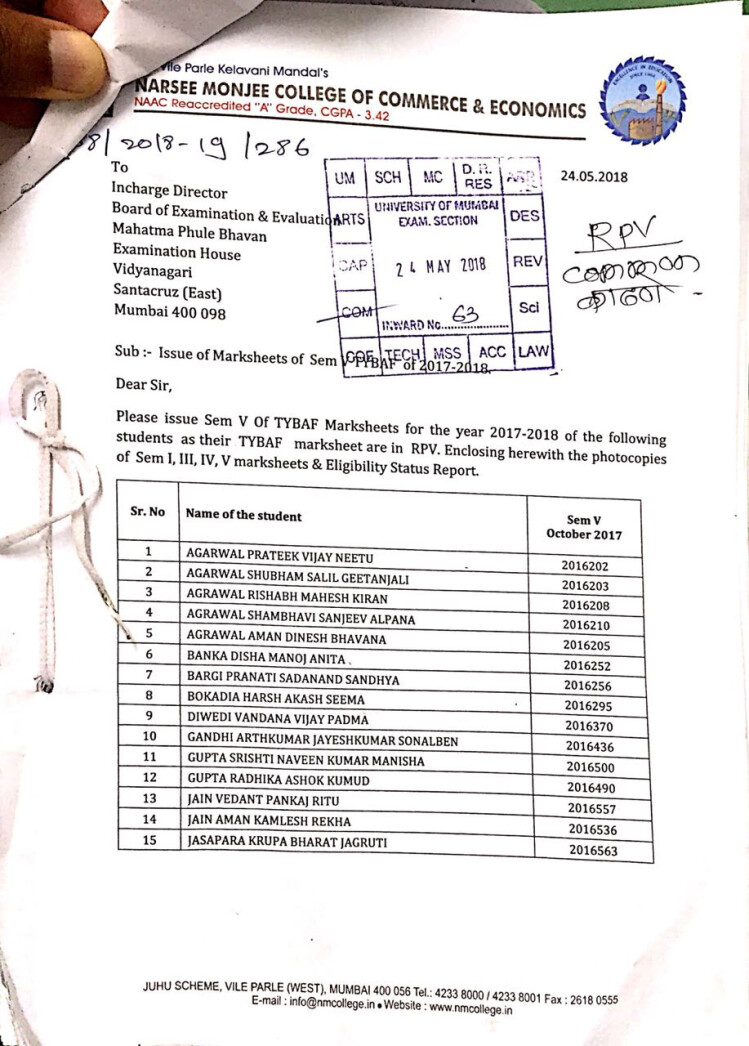 Narsee Monjee college — affiliated with the University of Mumbai — announced BAF’s third year, semester-V results on April 21, 2018. In the month of May, answer sheets were distributed as well. However, 27 students of the same college complained that the college deliberately didn’t issue their marksheets, in particular.