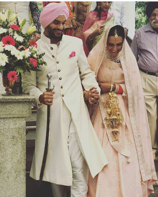 While the groom – Angad – looked dapper in a white sherwani, the bride – Neha – had donned a pink lehenga with traditional kaleerein and red chooda.