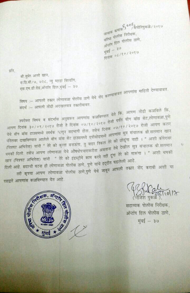 Zubair Khan has registered a police complaint against Salman Khan at Antop Hill Police Station.
