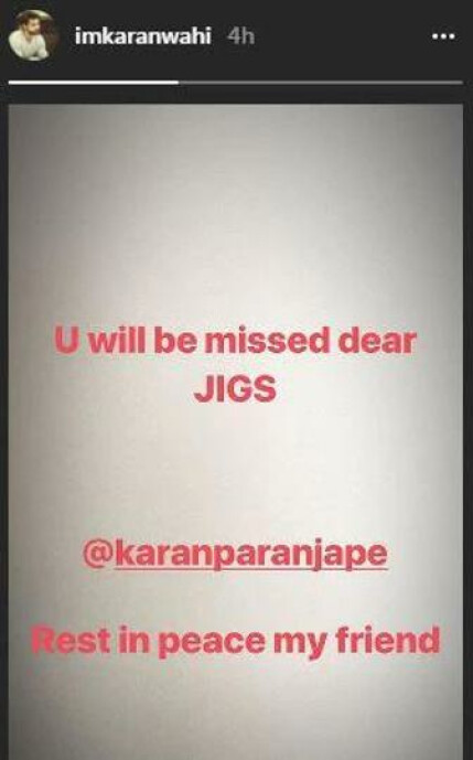 TV actor Karan Wahi shared the actor’s death news on his Instagram story. In a post, he wrote, “You will be missed JIGS.”