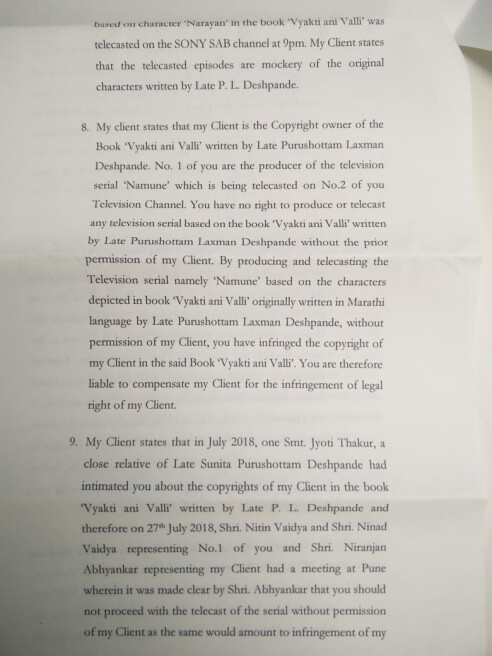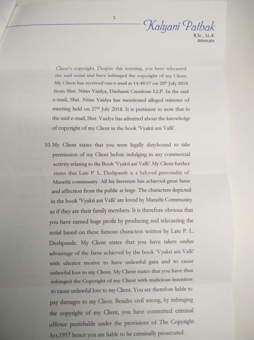 IUCAA sent a notice on August 10 and has claimed ₹50,00,000 as compensation for infringing the copyright and also for not holding back the telecast of further episodes. The notice states that copyright of PL Deshpande’s literature are currently owned by IUCAA. The copyright of Deshpande's literature was with his wife Sunita after his death. Later, in her will, she passes on the ownership of the copyright of Pu La’s work to IUCAA.
