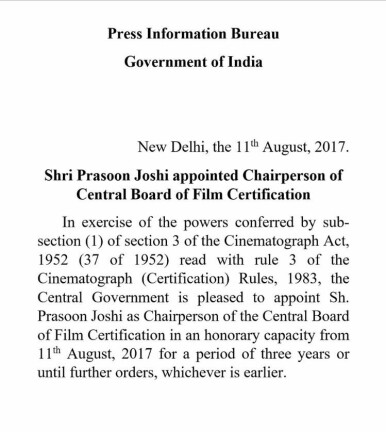 According to the reports, eminent lyricist, poet and adman Prasoon Joshi will be taking charge as the new chief. Further, Popular actress Vidya Balan will also be a part of the CBFC committee. Joshi's appointment is with immediate effect and he will be serving as the Chairperson for three years.