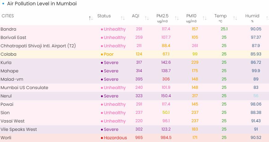 The official website of AQI India reveals that the quality of air in Mumbai, in the midnight on Wednesday, December 16, 2020, was 321. Most of the areas in the city like Bandra, Borivali, Powai, Vasai and others unhealthy air quality; however, Worli's air quality was marked as Hazardous, with the index showing a score of 965.