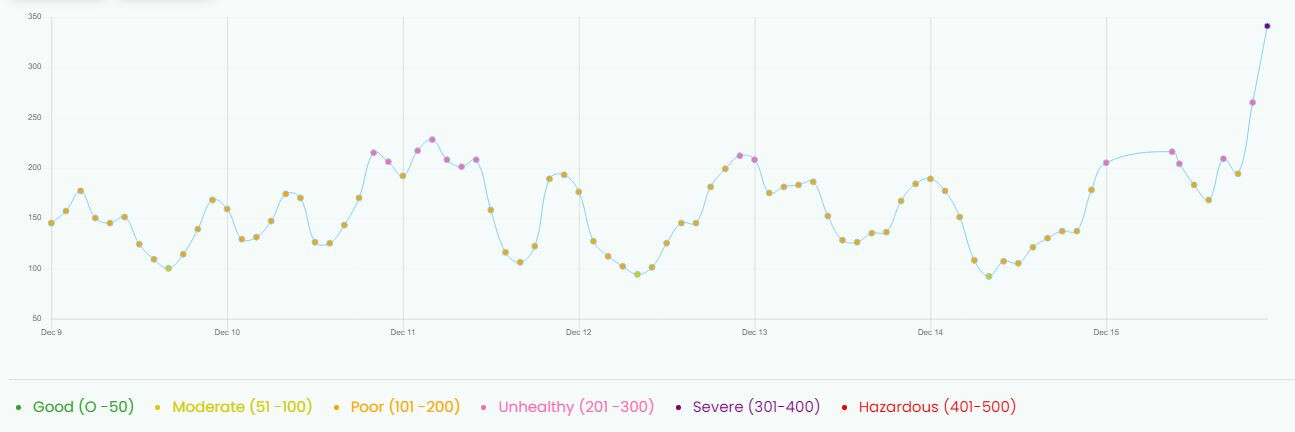 The website also suggested that the average AQI in the city, over the last seven days, was 161. The lowest average was recorded as 92, while the highest average was 341. Over the last month, i.e. from November 16, 2020, the average AQI was 171, with the lowest at 58, and highest at 455 on November 27, 2020.