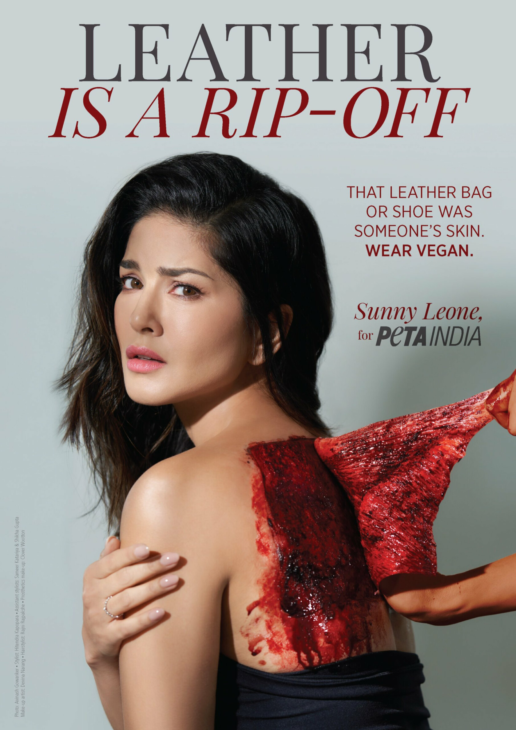 Bollywood's Sunny Leone unveiled her new ad for People for the Ethical Treatment of Animals (PETA) India today, at Lakmé Fashion Week's Sustainable Fashion Day. It shows her skin being "torn off" – a reference to the fact that more than a billion cows, buffaloes, and other animals are tormented, killed and skinned every year for the global toxic leather industry. The ad was shot by ace photographer Avinash