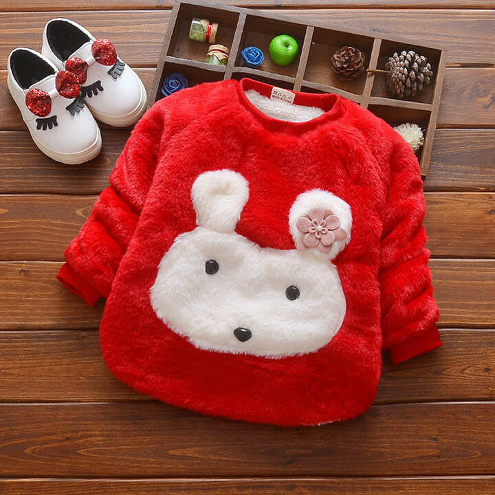 This red furry bunny sweater is bright and cute. When your daughter wears this lovely cardigan in the winter chill, she’ll spread happy vibes and warmth around. You can make her wear this on top of a woollen skirt, paired with leggings and boots or on top of trouser pants.