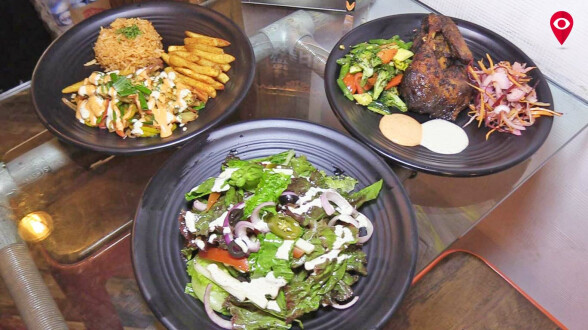 Lots of veggies with either meat, prawns or paneer, stir fried with herbs and served on a bed of rice with fries ... A complete meal in itself.