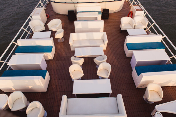 The floating restaurant is spread over three decks and comprises of an open-air bar deck, a restaurant lounge, and a private dining area. There are also three suites for those who wish to stay afloat for a little more than usual. The interiors of the deck and a gorgeous duo of blue and white, resonating beautifully with the sea.