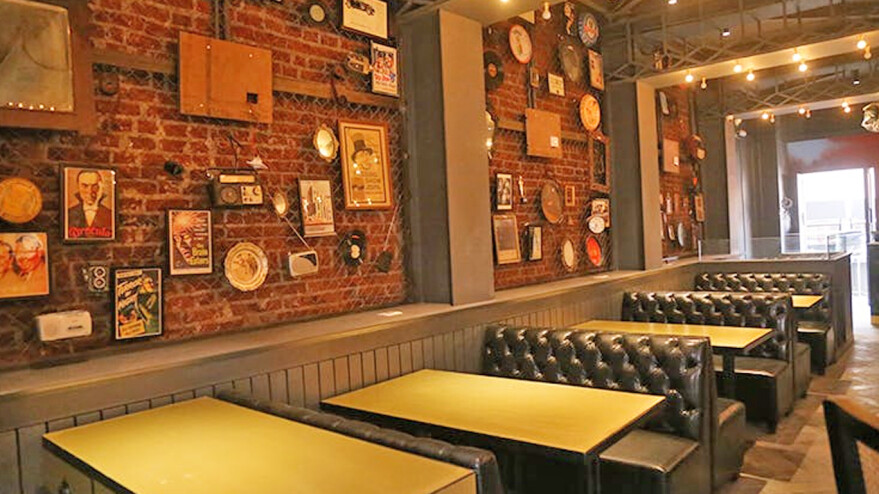 Above the seating, a wall is completely decorated with vinyl records, antique cameras, and items reflecting retro Hollywood that bring out the vibe of the space.