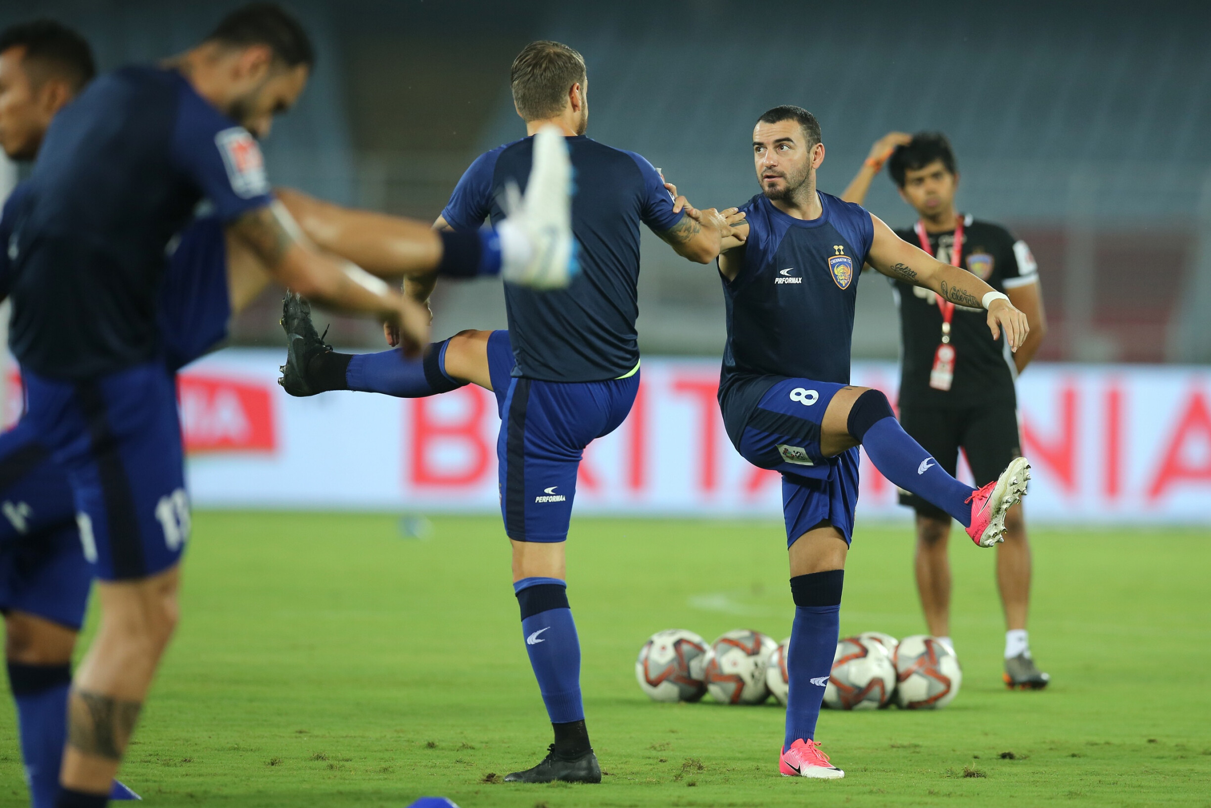 Carlos Salom of Chennaiyin FC warm up with the team players before the start of the match against Mumbai City FC in Hero ISL
