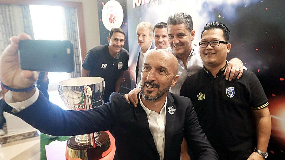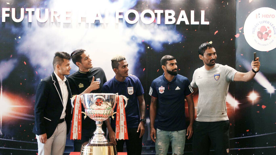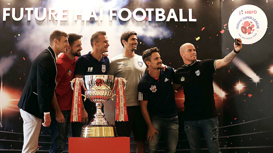 • Iain Hume of Kerala Blasters FC clicks a selfie with (L to R) John Johnson of Bengaluru FC, Bruno Filipe Tavares Pinheiro of FC Goa, Lucian Goian of Mumbai City FC, Henrique Sereno of Chennaiyin FC and Marcelo Leite Pereira of FC Pune