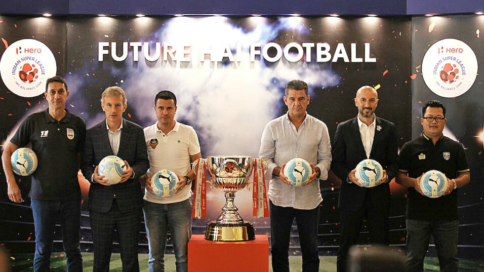 • (L to R) Mumbai City FC coach Alexandre Guimaraes, Bengaluru FC coach Albert Roca, FC Goa coach Sergio Lobera, Chennaiyin FC coach John Gregory, FC Pune City coach Ranko Popovic and Kerala Blasters assistant coach Thangboi Singto pose for a picture with the Hero ISL Trophy