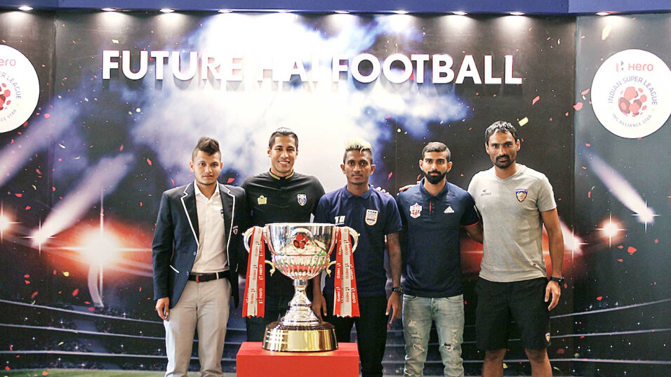 • (L to R) Nishu Kumar of Bengaluru FC, Arata Izumi of Kerala Blasters FC, Abinash Ruidas of Mumbai City FC, Kean Lewis of FC Pune City and Karanjit Singh of Chennaiyin FC pose with the Hero ISL Trophy