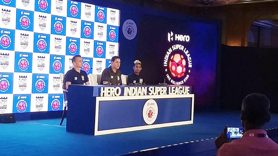 • (Back to Front) Mumbai City FC coach Alexandre Guimaraes, Bengaluru FC coach Albert Roca, FC Goa coach Sergio Lobera, Chennaiyin FC coach John Gregory, Kerala Blasters assistant coach Thangboi Singto and FC Pune City coach Ranko Popovic