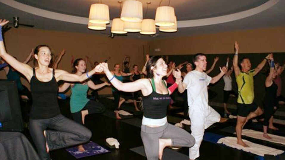 Karaoke yoga practitioners sing, dance, sweat and stretch their way to joy and physical fitness in a group setting.