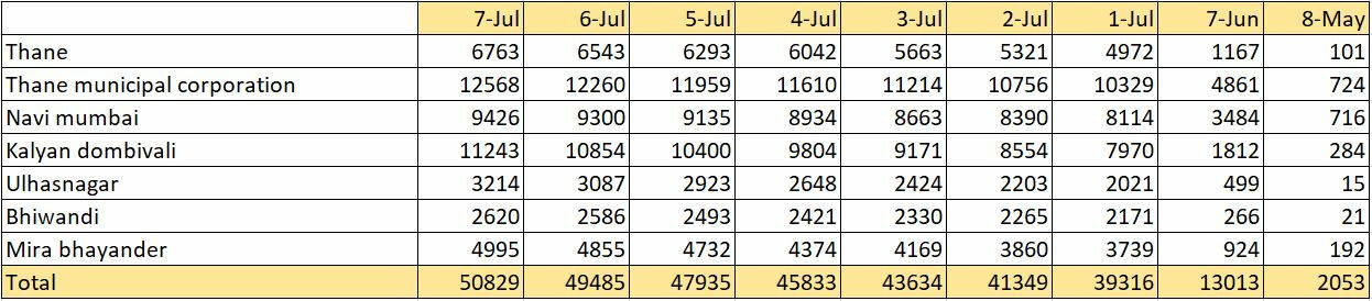Out of the 50,829 cases, a total of 11,243 cases are identified in Kalyan Dombivli, 12,568 from areas under Thane Municipal Corporation (TMC), 9,426 from Navi Mumbai, 6,763 from Thane, 4,995 from Mira-Bhayandar, 3,214 from Ulhasnagar, and 2,620 from Bhiwandi