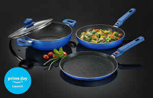 This is a 3-piece induction-base non-stick aluminium cookware set with a thick durable body and sleek rubberized handles. The set is available in Pearl Blue colour and is spoon-friendly, stain-free interiors-ideal for every kitchen.