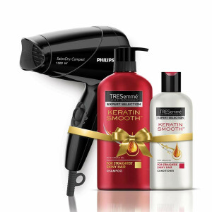 Get frizz-free salon-styled hair at every wash with the goodness of Argon oil and keratin protein with Tresemme Keratin Smooth. When used together with keratin smooth conditioner, it controls frizz for up to 48 hours and transforms your hair to be gorgeously straighter, more manageable and easy to style. The combo includes Tresemme Keratin Smooth Shampoo and Conditioner as well as a Philips Hair Dryer.