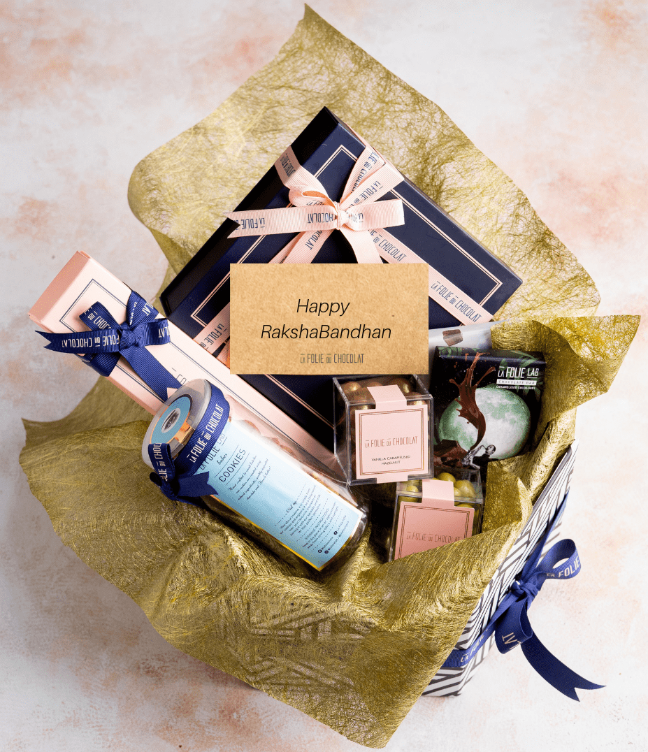 Those looking for more elaborate gifting options can choose from two hampers: the first is the Raksha Bandhan Hat Box Hamper which is filled with nine ganaches; one Bar of Smoked Pink Sea Salt Chocolate; or Caramelised Cocoa Nibs, and one Box of Butterscotch Nuggets. The hat box is priced at ₹2300 plus taxes, and an eco-friendly rakhi can be added on for ₹225.